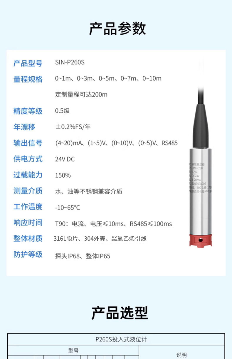 聯(lián)測儀表SIN-P260S新款投入式液位計(jì)產(chǎn)品特點(diǎn):產(chǎn)品精度高、體積小、使用方便