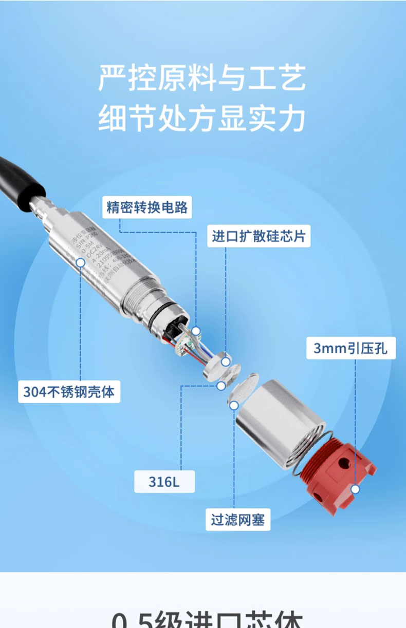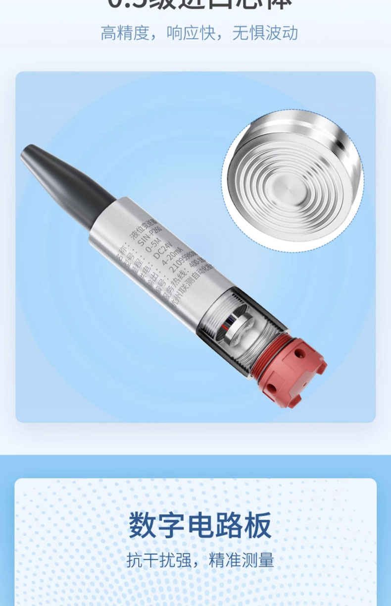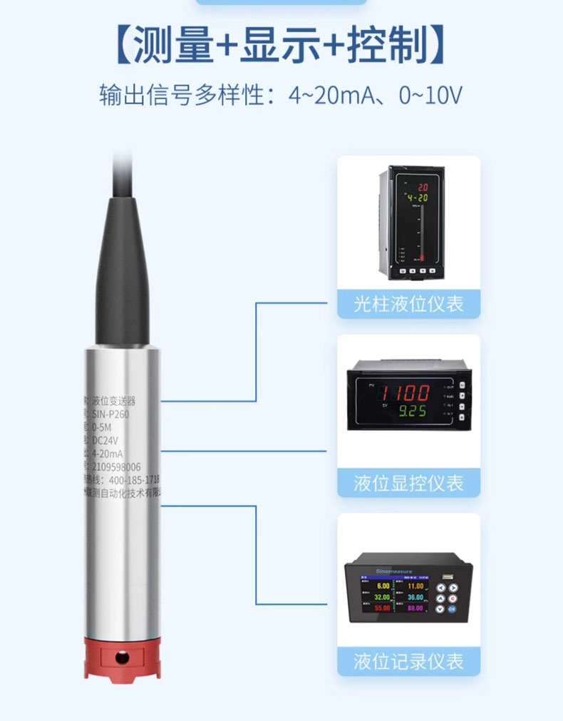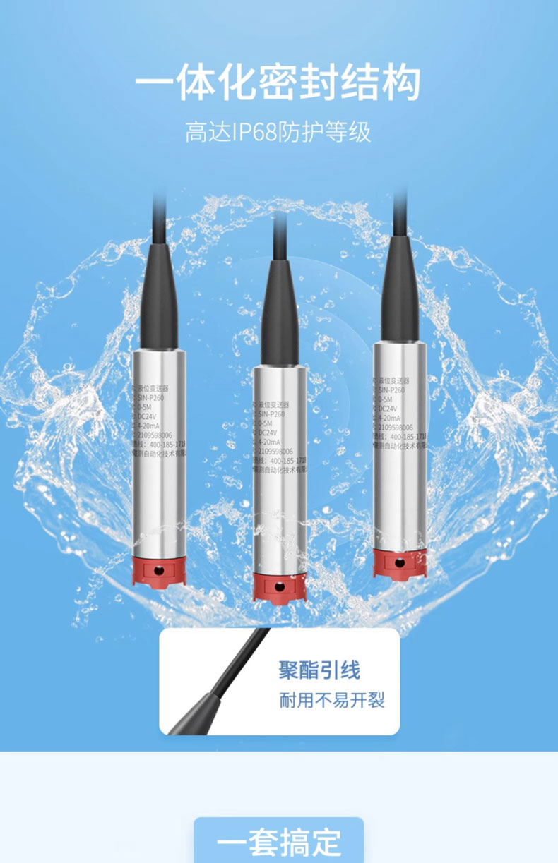 聯(lián)測儀表SIN-P260S新款投入式液位計(jì)由高性能擴(kuò)散硅壓阻式壓力傳感器作為測量元件,把與液位深度成正比的液體靜壓力準(zhǔn)確測量出來,并經(jīng)過信號調(diào)理電路轉(zhuǎn)換成標(biāo)準(zhǔn)(電流或電壓)信號輸出,建立起輸出信號與液體深度的線性對應(yīng)關(guān)系,實(shí)現(xiàn)對液體深度的測量。產(chǎn)品精度高、體積小,直接投入液體中,即可測量出變送器末端到液面的液體高度,使用方便。適用于石油、化工、 電廠、城市供水、水文勘探領(lǐng)域的液位測量與控制。